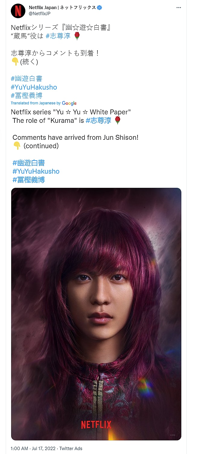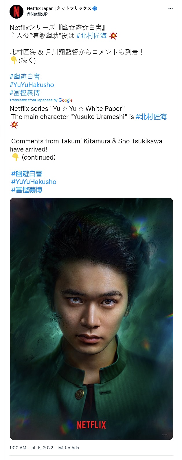 “I am happy to be able to deliver the historical masterpiece ‘YuYu Hakusho’ as a live-action series, as I thought that Japan needs to send out more and more messages to the world,” the actor concluded. “I wish for the further spread of Japanese entertainment and to create a work that people around the world can enjoy.”
