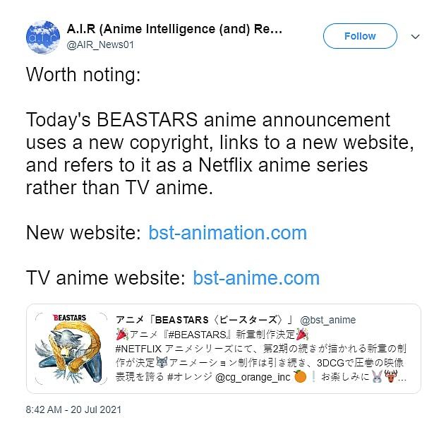 However, in one notable change, as reported by anime news Twitter account A.I.R. (Anime Intelligence and Research) when it was first announced on July 20th, 2021, this season will see Netflix have a bigger stake in Beastars‘ production.