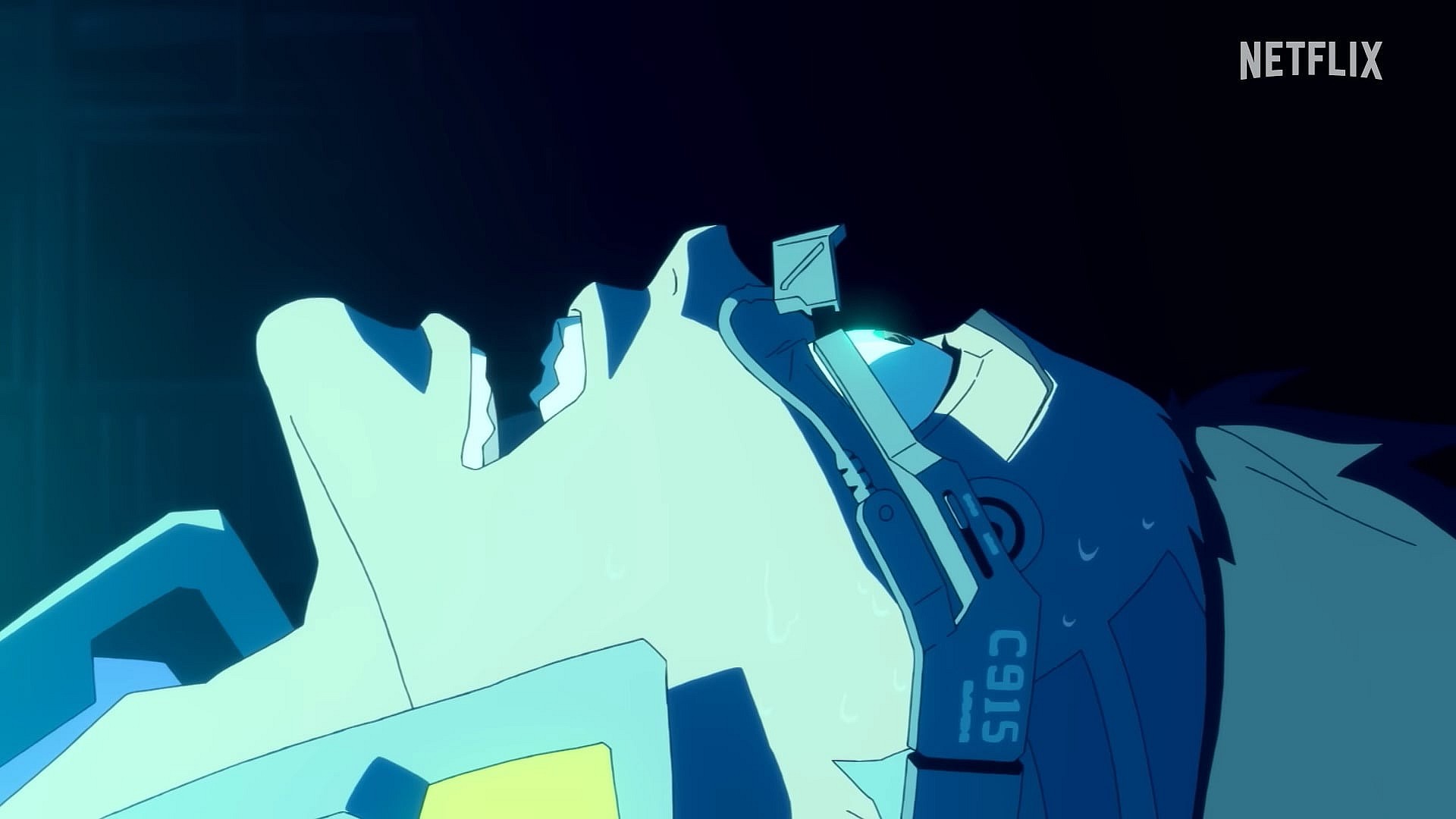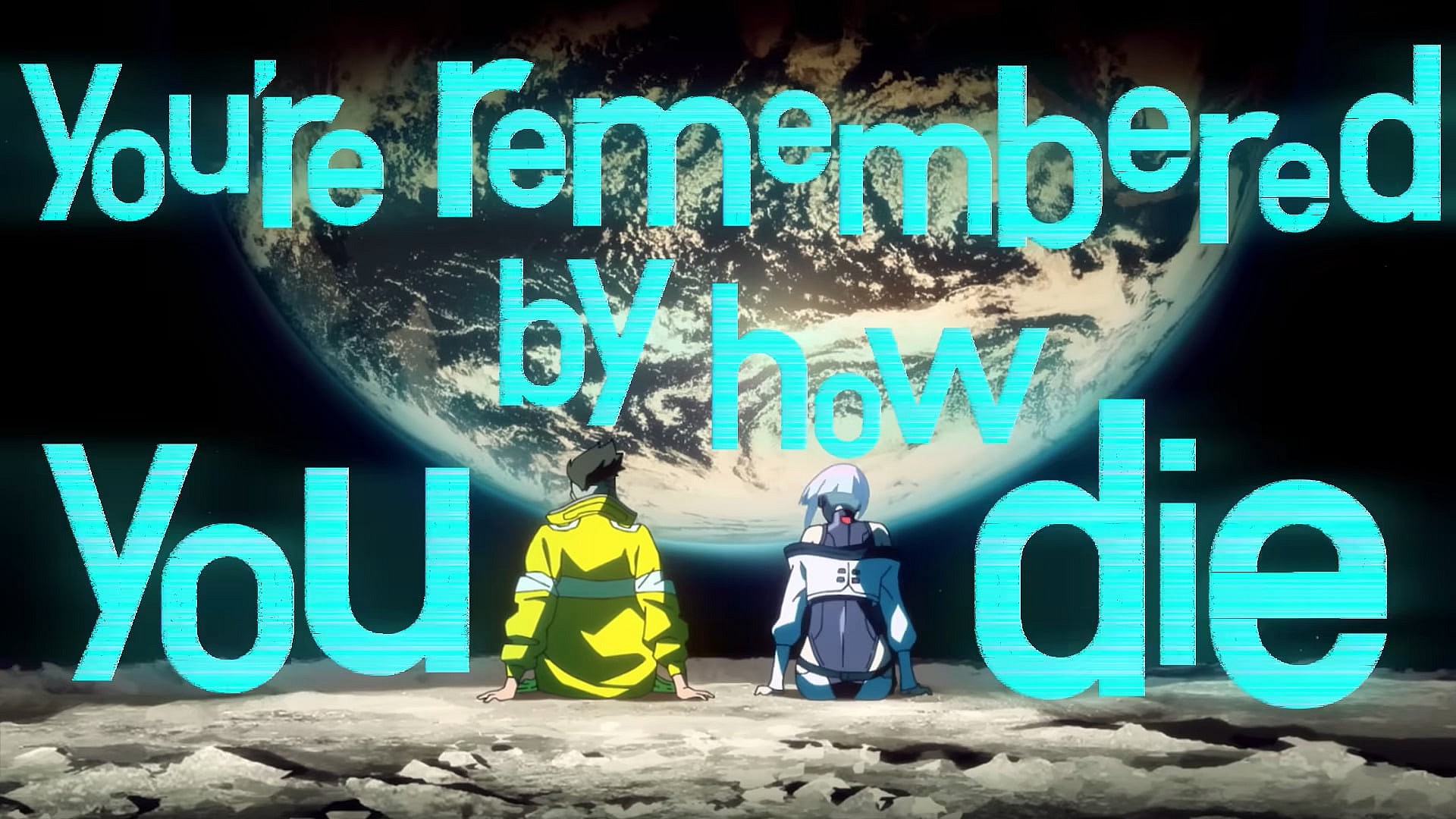 The scene then cuts to a montage of various action scenes interspersed among an intense sequence depicting David giving his body over to cybernetic modification and becoming an Edgerunner.