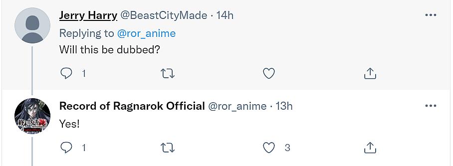 Record of Ragnarok confirmed the dub on Twitter responding, “Yes” when a fan asked, “Will this be dubbed?”