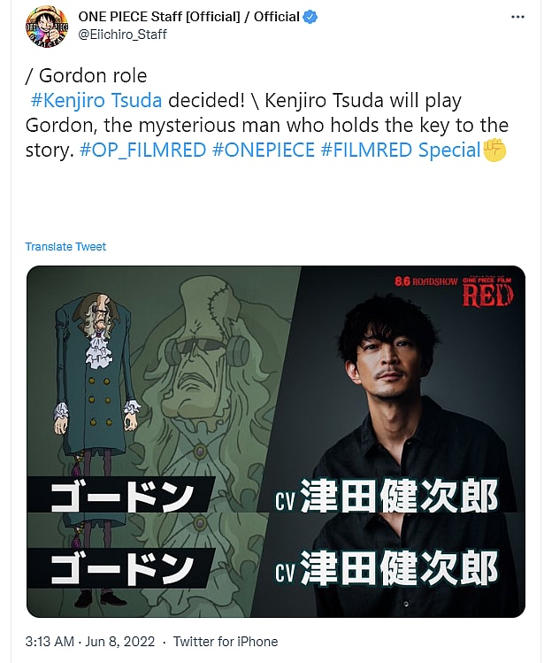 Hosted by Fuji TV anchor Ryusei Ikuta alongside actress Sakura Ando and featuring appearances from Luffy voice actress Mayumi Tanaka, Usopp voice actor Kappei Yamaguchi, Japanese comedian Yusuke Inoe, and actress Rina Asakawa, the stream opened with the announcement of the official casting decision for Gordon, an original character conceived by Oda for the film.