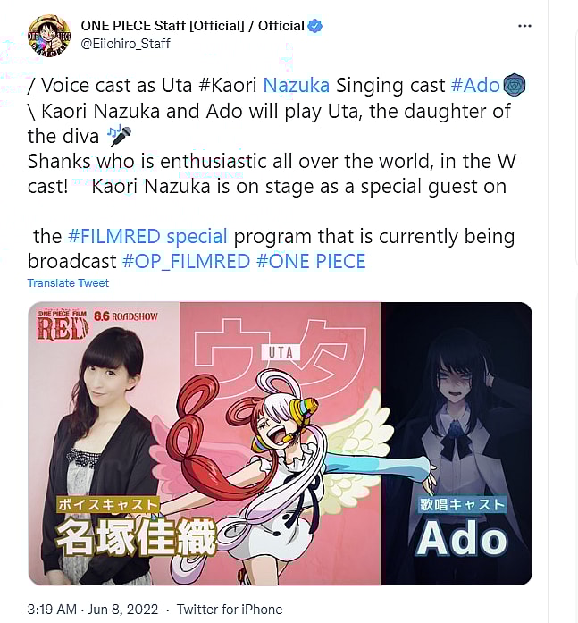 This news was followed by a subsequent casting announcement in which it was revealed that Shanks’ supposed daughter and the film’s central character, Uta, will have her speaking voice provided by Kaori Nazuka, with her singing pipes provided by Japanese singer Ado.