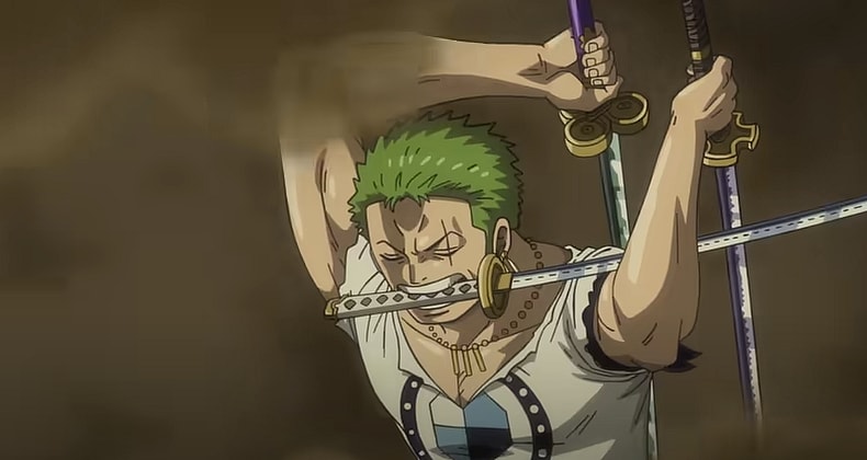 Zoro wielding his swords, one of which is the purple-hilted Enma he recently acquired in Wano, his wielding of which places the film sometime during or after the recently-wrapped story arc: