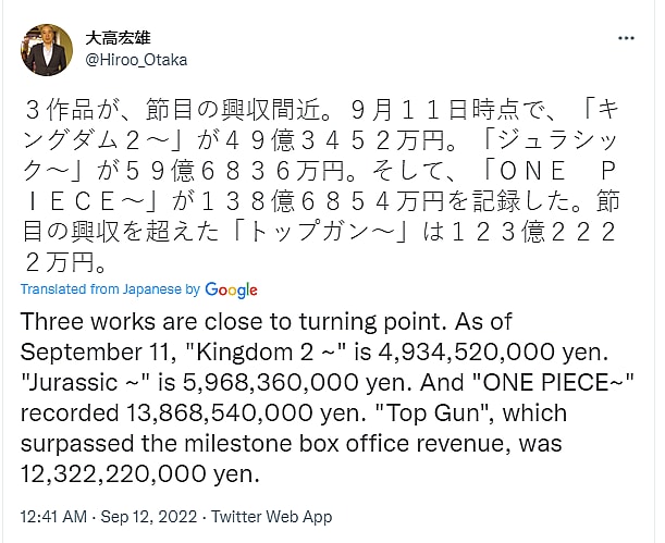 As per a September 12th tweet by journalist Hiroo Otaka, as of that day, Japan’s top films per box office revenue were the sequel to the live-action Kingdom movie (¥4,934,520,000), Jurassic World (¥5,968,360,000), Top Gun: Maverick (¥12,322,220,000) and finally, Film: Red (¥13,868,540,000).