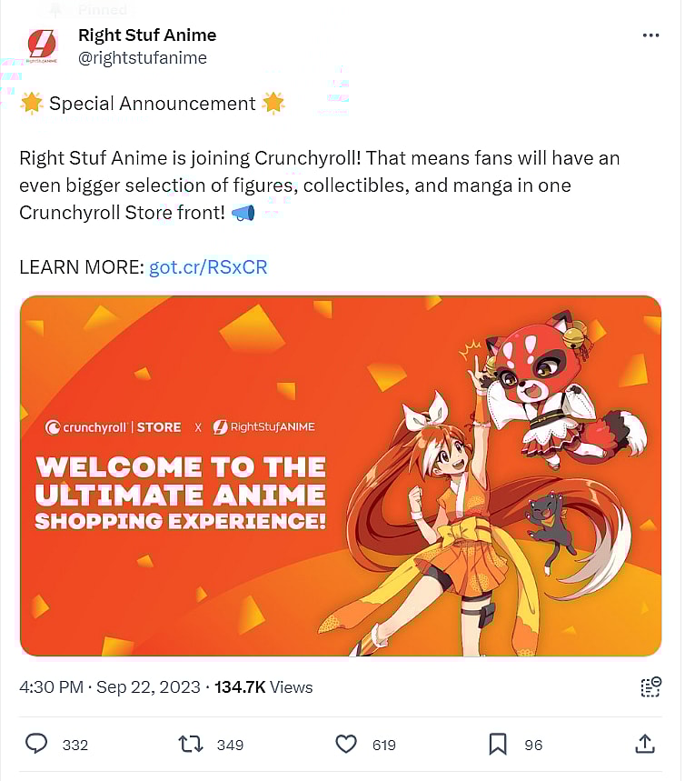Crunchyroll acquired Right Stuf last August announcing in a blog post, “We’re delighted to announce that Right Stuf, one of the world’s leading online anime superstores, has officially joined the Crunchyroll family.”