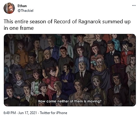 Sharing a frame from the series, which sees audience members in attendance at the Ragnarok Tournament and asking “How come neither of them is moving, @Thackiel declared that the image summed up “this entire season.”