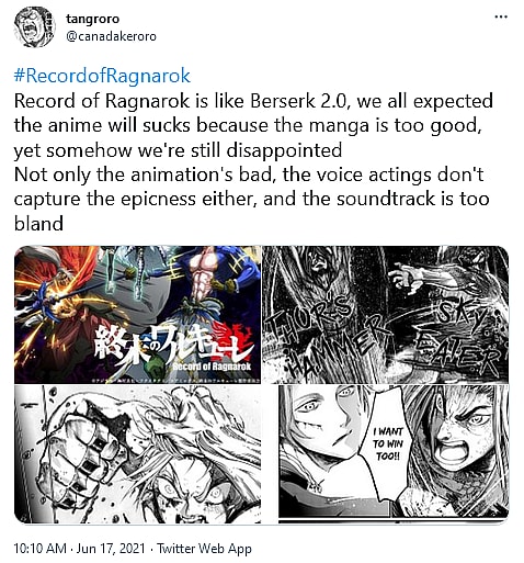 “Record of Ragnarok is like Berserk 2.0, we all expected the anime will sucks because the manga is too good, yet somehow we’re still disappointed,” said @canadakeroro, comparing Record of Ragnarok to the abysmal 2016 CGI adaptation of Berserk. “Not only the animation’s bad, the voice actings don’t capture the epicness either, and the soundtrack is too bland.”