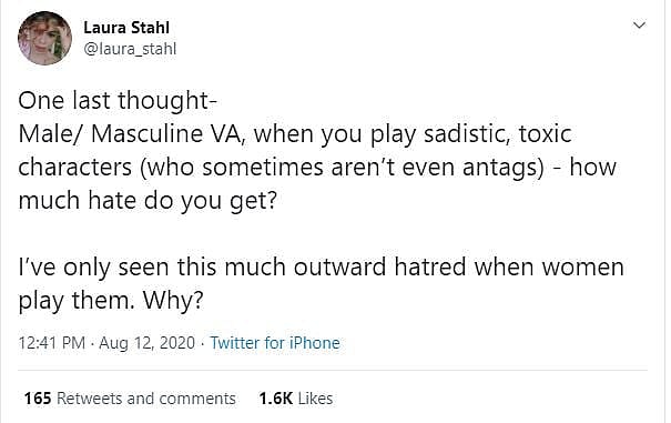 She then stated, “One last thought- Male/Masculine VA, when you play sadistic, toxic characters (who sometimes aren’t even antags) – how much hate do you get? I’ve only seen this much outward hatred when women play them. Why?”