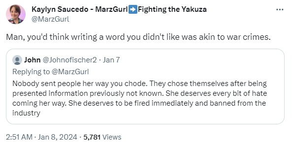 On January 8th, offering her own take on the discourse, Lupin III: Prison of the Past Video Technician Kaylyn Saucedo dismissively asserted that fans unhappy with the English localization industry’s constant butchering of Japanese works and declare were acting as if “writing a word you didn’t like was akin to war crimes.”