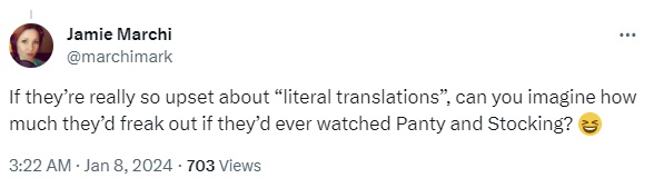 In turn, Marchi taunted, “If they’re really so upset about ‘literal translations’, can you imagine how much they’d freak out if they’d ever watched Panty and Stocking?“