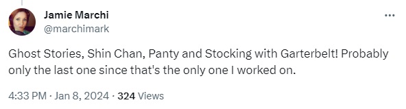 “Ghost Stories, [Crayon] Shin Chan, Panty and Stocking with Garterbelt!” further declared Marchi before passive-aggressively opining that “probably only the last one [would make them angry] since that’s the only one I worked on.”