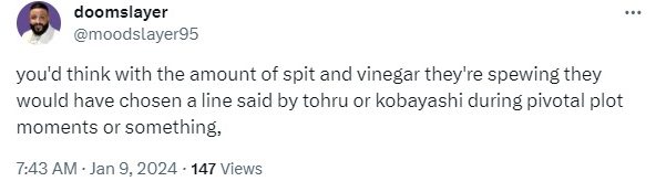 Replying to Marchi, @moodslayer95 then asserted, “You’d think with the amount of spit and vinegar they’re spewing they would have chosen a line said by Tohru or Kobayashi during pivotal plot moments or something.”