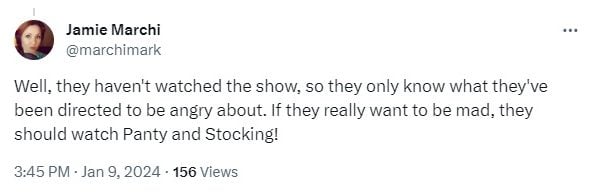 At that point choosing to add more fuel to the fire, Marchi then mocked, “Well, they haven’t watched [Miss Kobayashi’s Dragon Maid], so they only know what they’ve been directed to be angry about. If they really want to be mad, they should watch Panty and Stocking!“