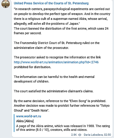 As of writing, with the ban of Akira, the Russian government has thus far banned a total of thiren anime productions from distribution within its borders, including the three aforementioned series as well as Elfen Lied, Interspecies Reviewers, Inuyashiki, Naruto, Nekopara, Princess Lover, That Time I Got Reincarnated As A Slime, and Zombieland Saga.