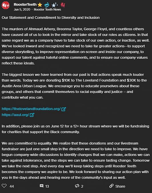 “We are committed to equality. We realize that these donations and our livestream fundraiser are just one small step in the direction we need to take to improve. We have begun company-wide discussions to identify changes that we can make, actions we can take against intolerance, and the steps we can take to ensure lasting change,” Rooster Teeth then stated.