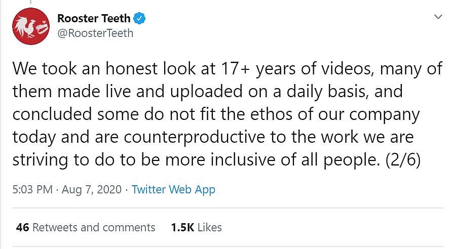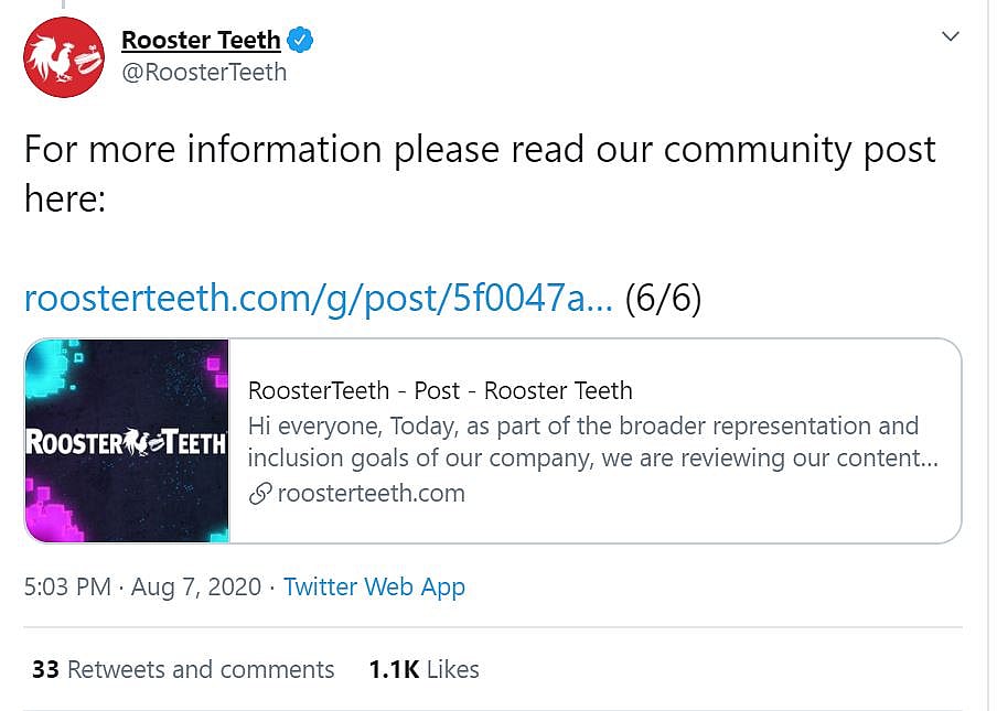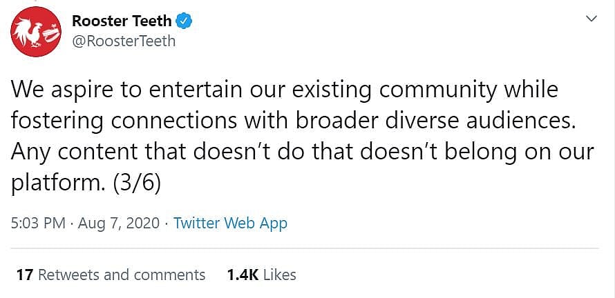 Rooster Teeth wrote on Twitter, “This is your regular reminder that we happily and proudly stand for social justice.”