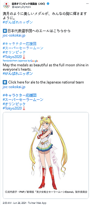 “May the medals as beautiful as the full moon shine in everyone’s hearts,” cheered Sailor Moon, according to a machine translation of the offending tweet provided by Google Translate.