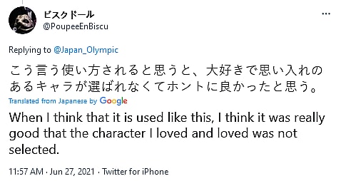 @PoupeeEnBiscu wrote, “When I think that she’s being used like this, I think it was really good that the character I really loved was not selected [as a character ambassador].”