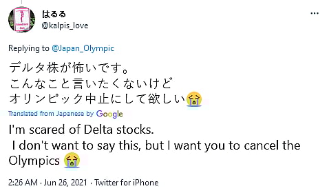 “I’m scared of [the Delta strain],” wrote @kalpis_love. “I don’t want to say this, but I want you to cancel the Olympics.”