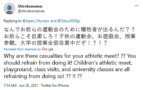 “Why are there casualties for your athletic meet???,” exclaimed @shirokumamac. “You should refrain from doing it! Children’s athletic meet, playground, class visits, and university classes are all refraining from doing so!??!!??”