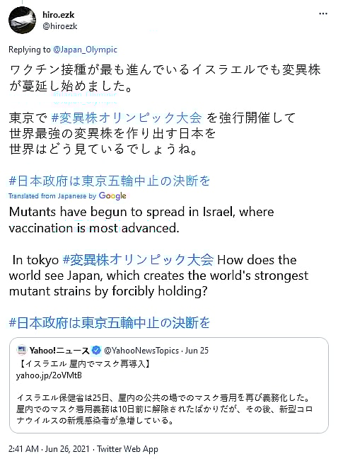 @hirozek noted, “[COVID-19 mutations] have begun to spread in Israel, where vaccination is most advanced,” and warned, “Forcibly holding #MutantOlympicGames in Tokyo [could lead] to Japan producing the world’s strongest mutant strains.”