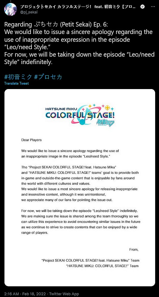 “The ‘Project SEKAI COLORFUL STAGE! Feat. Hatsune Miku’ and ‘HATSUNE MIKU: COLORFUL STAGE!’ teams’ goal is to provide both in-game and outside-the-game content that is enjoyable by fans around the world with different cultures and values,” they continued. “We would like to issue a most sincere apology for releasing inappropriate and insensitive content, although it was unintentional, we appreciate many of our fans for pointing the issue out.”