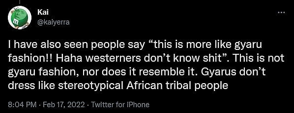 “I have also seen people say ‘this is more like gyaru fashion!! Haha westerners don’t know s–t’,” she added. “This is not gyaru fashion, nor does it resemble it. Gyarus don’t dress like stereotypical African tribal people”.