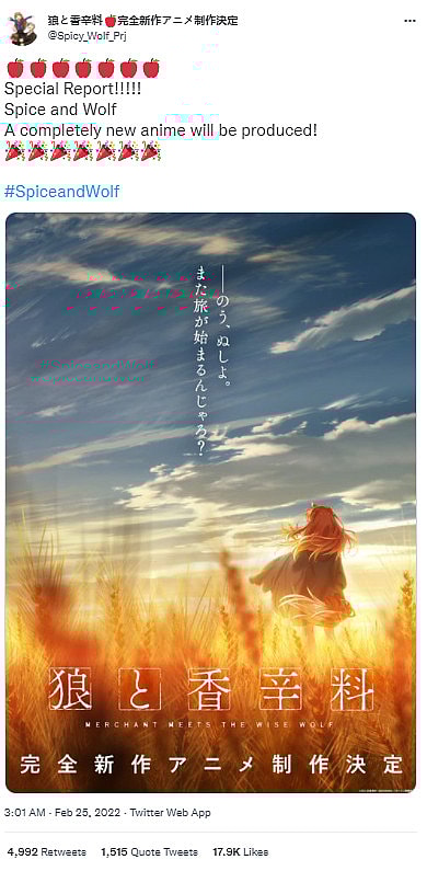 “And this time, the production of a completely new animation of ‘Wolf and Spice’ has been decided!”, they continued. “With the support of our fans, the story of the wise wolf Holo and the merchant Lawrence continues.”