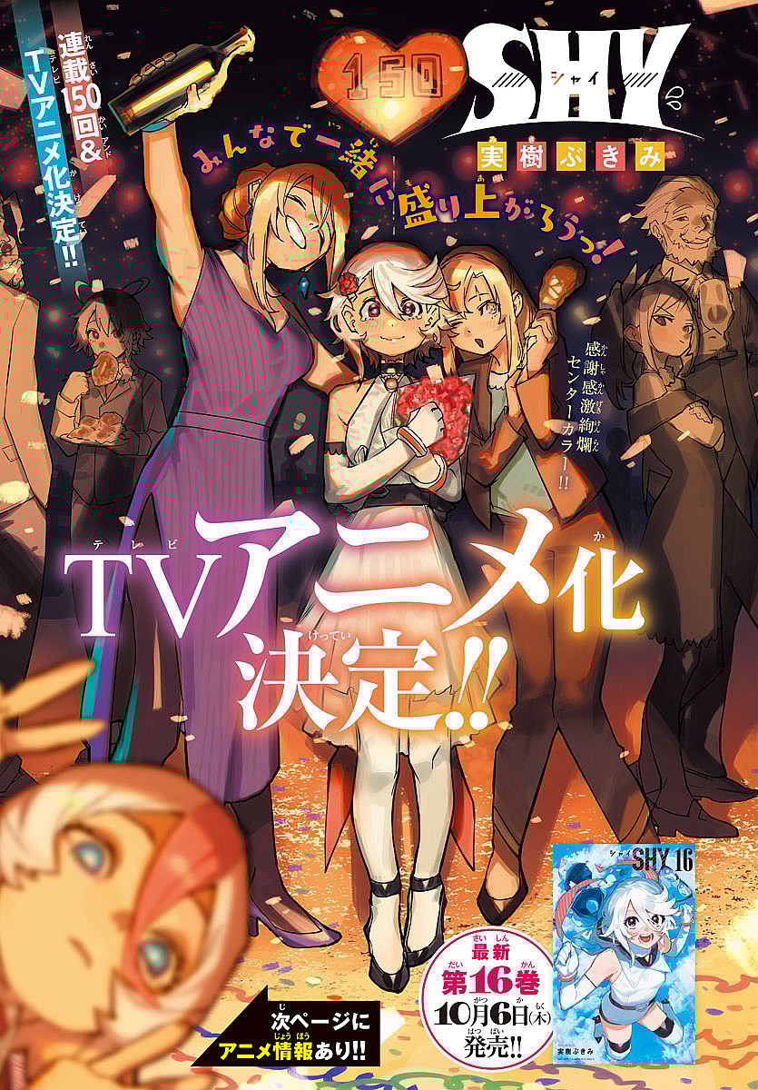The next day, SHY‘s home magazine Akita Shoten’s Weekly Shounen Champion published a new color spread by Miki illustrated in honor of both the anime adaptation’s announcement and the release of the series’ latest volume.
