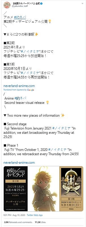 According to the announcement, the second season of The Promised Neverland will air every Thursday on Fuji TV starting in January 2021.