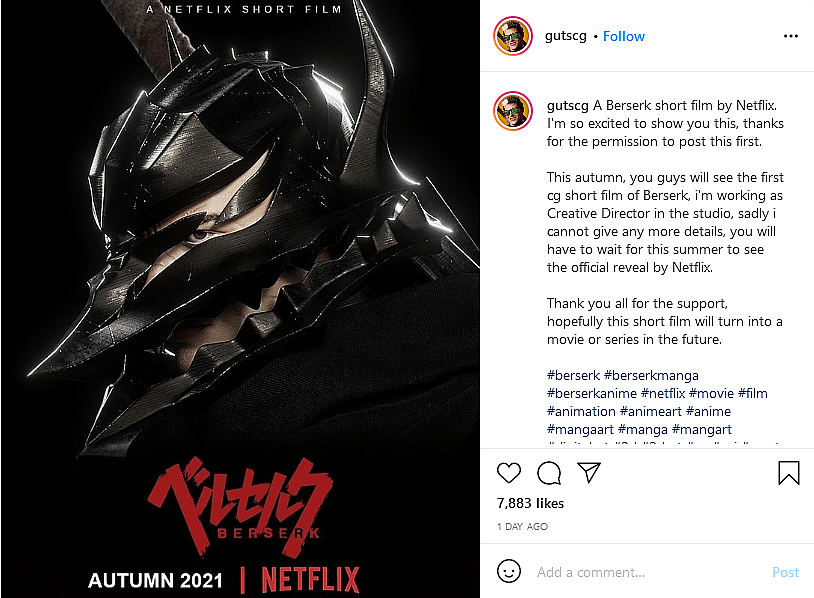 “This autumn, you guys will see the first cg short film of Berserk, i’m working as Creative Director in the studio,” Carrillo continued. “sadly i cannot give any more details, you will have to wait for this summer to see the official reveal by Netflix.”