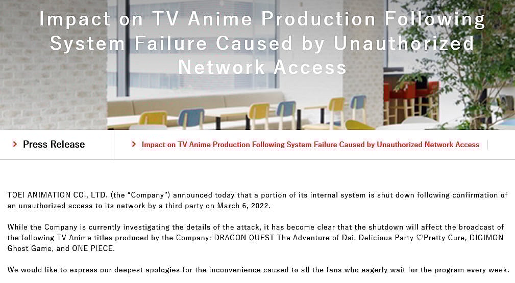 Toei Animation Reveals Recent Hack Was Result Of Targeted Ransomware Attack
