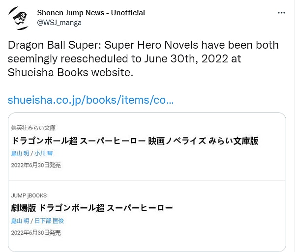 Conversely, the Dragon Ball Super Super Hero novel, despite being similarly pushed back from its intended April 25th release, has already been given a new street date of June 30, 2022 by Shueisha’s official Shonen Jump store.