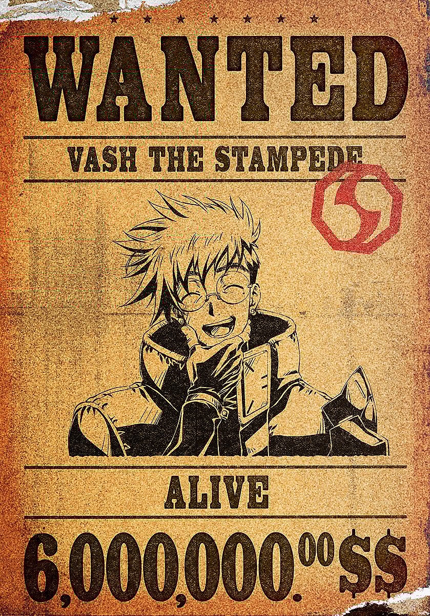 Over a shot of the familiar two moons of Trigun’s desert planet setting, Vash begins an internal monologue regarding his brother, Knives (CV: Junya Ikeda: Joe Kido in Digimon Tri), all the while holding up his wanted poster.