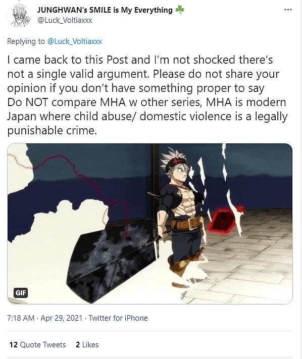 However, that wasn’t the user’s final message. The user then tweeted, “I came back to this Post and I’m not shocked there’s not a single valid argument. Please do not share your opinion if you don’t have something proper to say. Do NOT compare MHA w other series, MHA is modern Japan where child abuse/domestic violence is legally punishable crime.”