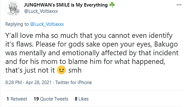 Luck_Voltiaxxx would later add in the thread, “Y’all love mha so much that you cannot even identify it’s flaws. Please for gods sake open your eyes, Bakugo was mentally and emotionally affected by that incident and for his mom to blame him for what happened, that’s just not it smh.”