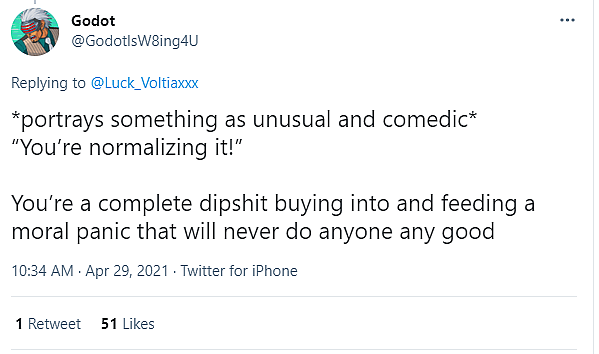 GodotIsW8ing4U wrote, “*portrays something as unusual and comedic* ‘You’re normalizing it!'”