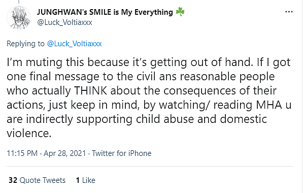 Next, the user wrote, “I’m muting this because it’s getting out of hand. If I got one final message to the civil ans reasonable people who actually THINK about the consequences of their actions, just keep in mind, by watching/reading MHA u are indirectly supporting child abuse and domestic violence.”