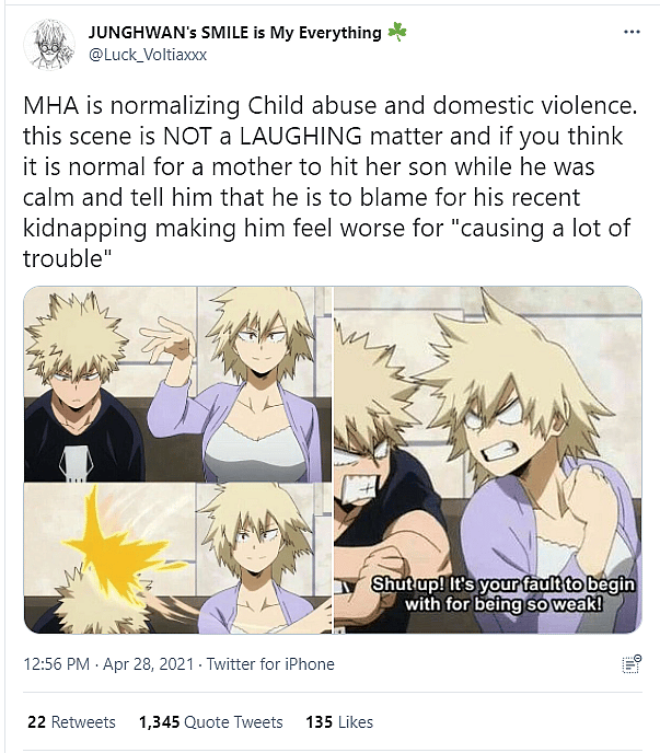 The user wrote, “MHA is normalizing Child abuse and domestic violence. this scene is NOT a LAUGHING matter and if you think it is normal for a mother to hit her son while he was calm and tell him that he is to blame for his recent kidnapping making him feel worse for ‘causing a lot of trouble’ then you need a therapist.”