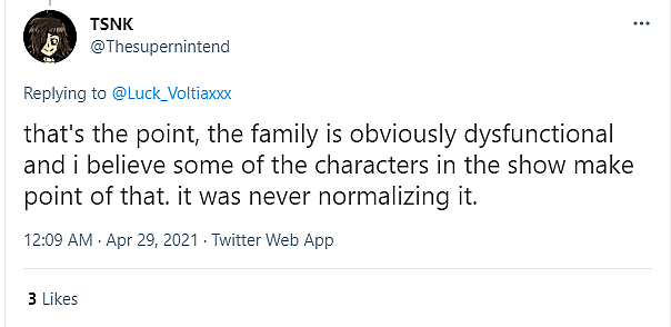 Twitter user thesupernintend wrote, “that’s the point, the family is obviously dysfunctional and i believe some of the characters in the show make point of that. it never normalizing it.”