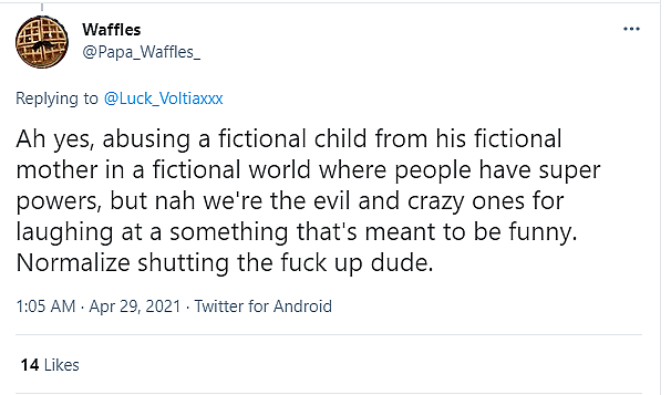 Another wrote, “Ah yes, abusing a fictional child from his fictional mother in a fictional world where people have super powers, but nah we’re the evil and crazy ones for laughing at a something that’s meant to be funny. Normalize shutting the f*** up dude.”