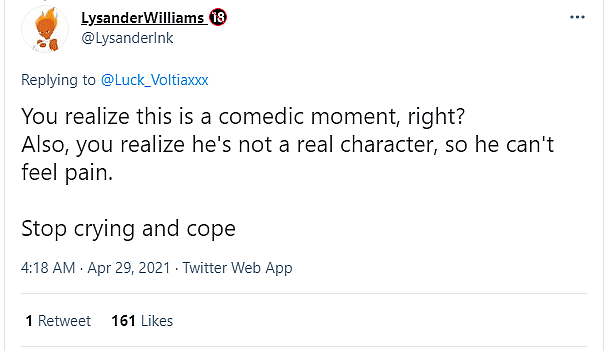 And LysanderInk wrote, “You realize this is a comedic moment, right? Also, you realize he’s not a real character, so he can’t feel pain. Stop crying and cope.”