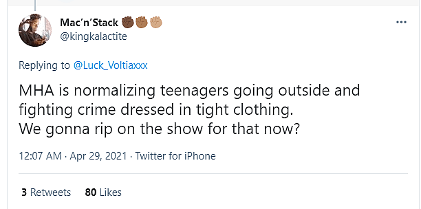 One user wrote, “MHA is normalizing teenagers going outside and fighting crime dressed in tight clothing. We gonna rip on the show for that now?”