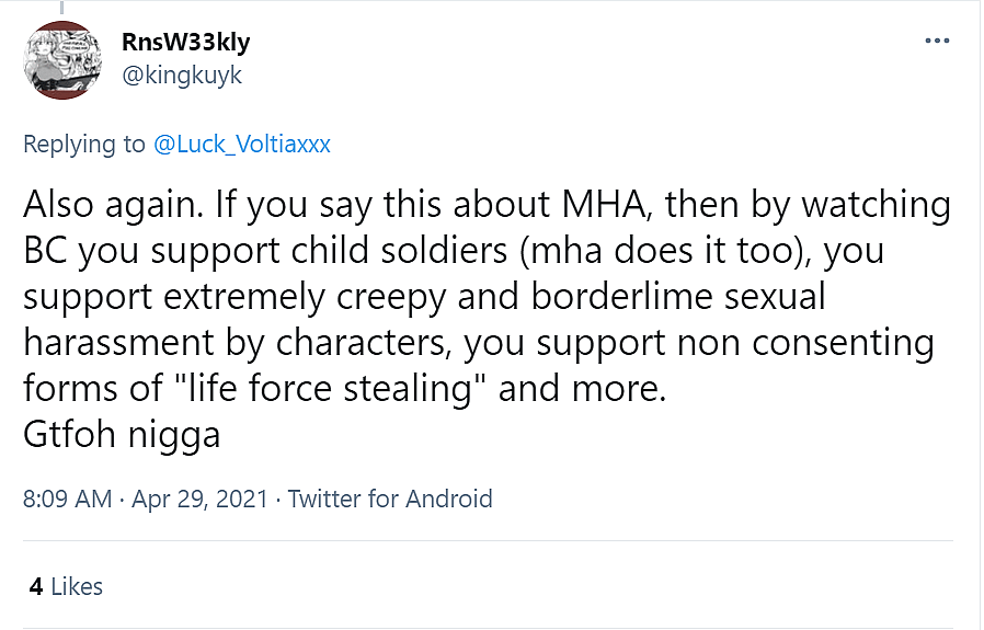In one interesting back and forth, Twitter user Kingkuyk wrote, “Also again. If you say this about MHA, then by watching BC you support child soldiers (mha does it too), you support extremely creepy and borderlime sexual harassment by characters, you support non consenting forms of ‘life force stealing’ and more. Gtfoh n****.”