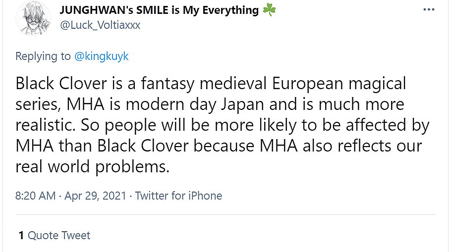 Voltiaxxx responded, “Black Clover is a fantasy medieval European magical series, MHA is modern day Japan and is much more realistic. So people will be more likely to be affected by MHA than Black Clover because MHA also reflects our real world problems.”