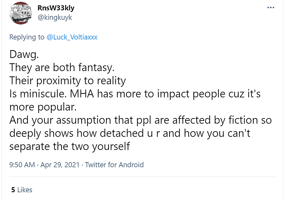 He responded, “Dawg. They are both fantasy. Their proximity to reality is miniscule. MHA has more to impact people cuz it’s more popular.”