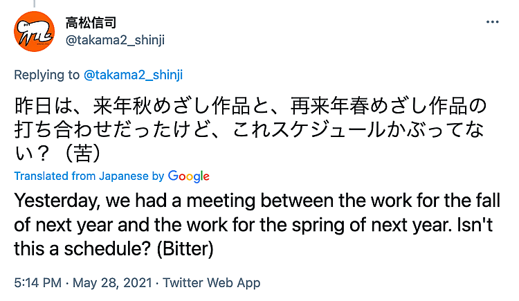 Recalling how, recently, he had “a meeting for a work that we’re aiming to broadcast in fall next year and another one for spring the year after,” Takamatsu then asked, “but isn’t this a strain on the schedule? (sheepish smile)”