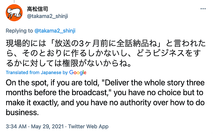 “If we at the studio are told, ‘Deliver all the episodes three months before the broadcast,’ then we have no choice but to make it according to that deadline,” said Takamatsu in conclusion to his thread. “We don’t have the authority to decide how to do business with it.”