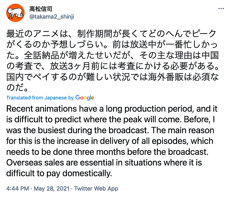 “It used to be busiest during the broadcast,” wrote Takamatsu, according to a translation of his tweets provided by Anime News Network. “Nowadays there are more cases where all the episodes have to be delivered at once, and the main reason for this is because they have to go through a content check for China.”