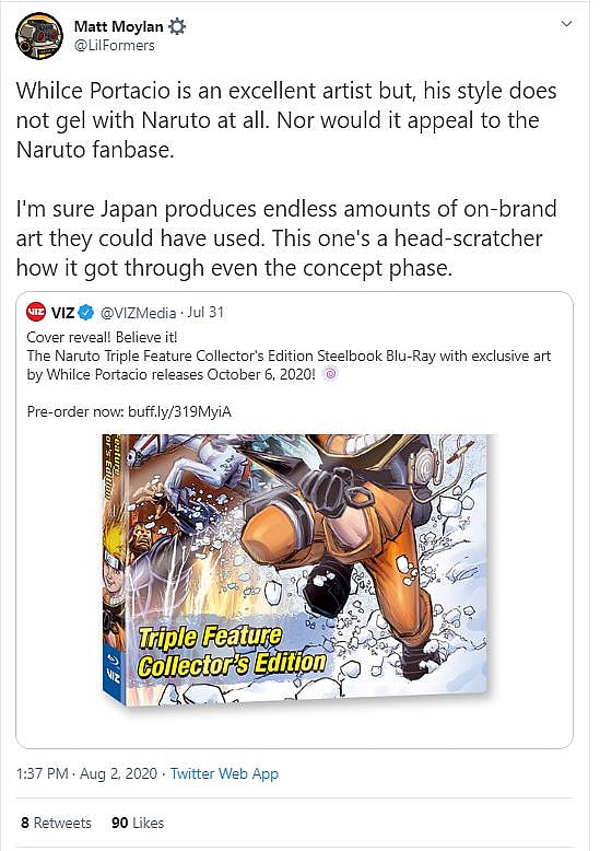 Director of Publishing at UDON Entertainment Matt Moylan added his own thoughts writing, “While Portacio is an excellent artist but, his style does not gel with Naruto at all. Nor would it appeal to the Naruto fanbase.”